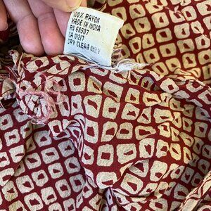 Vintage Le Chateau midi dress in a red/beige batik-style print. Dress has three decorative chunky buttons at front of bodice, and three adjustable tie closures at the back of bodice. Loose, flowy skirt. 100% rayon, tag says "Dry Clean Only". Made in India. Women's size "Small" - see below for garment measurements. Pre-owned condition: fabric has a few small snags from normal wear, back has a small black spot near center back tie (see close-up photo).