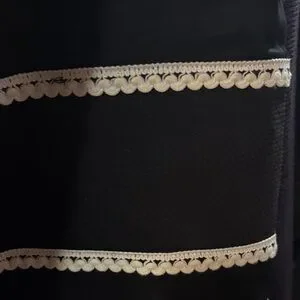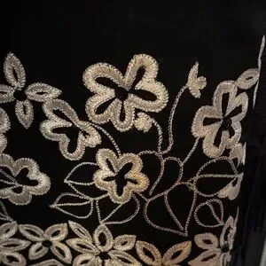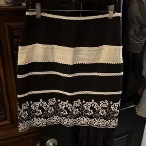 Chic pencil skirt with bold black and white stripes. Features intricate floral embroidery at the hem. Perfect for stylish occasions.