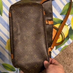Elegant pouch with iconic monogram pattern. Features tan leather accents and zipper closure. The interior is canvas and has scratches. She is a workhorse and has lots of life left. I just work remote now so I dont need a big bag to transport back and forth to work.