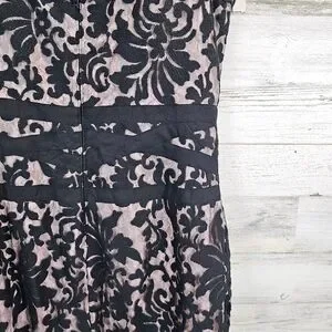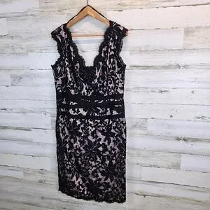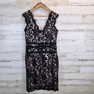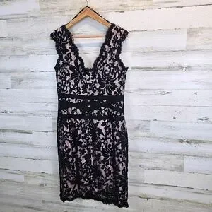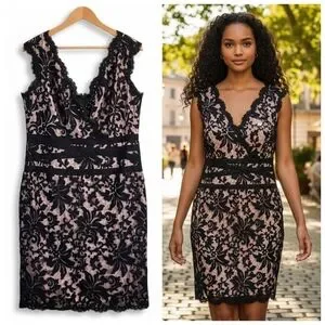 Turn heads in this Tadashi Shoji lace sheath dress, a beautifully crafted piece featuring intricate black floral lace overlay on a soft blush-nude lining. The scalloped V-neckline and illusion lace trim add a romantic, feminine touch that flatters every curve. Perfect for weddings, cocktail events, or any special evening where timeless elegance shines.