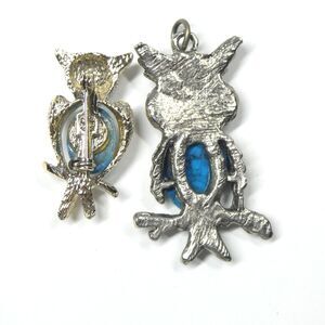 Vintage owl pendant and brooch. Not a matched set, though they work well together. They have (faux?) turquoise bellies. They are unsigned. Good shape with minor surface wear.