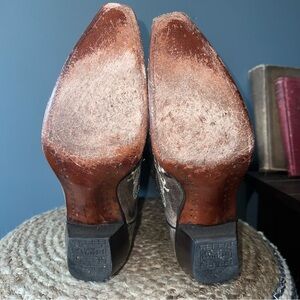 Corral Boots with Distressed Tobacco Colored Leather with Cream Embroidery and Sequin Crosses on Shaft. More Details In Photos including measurements. Beautiful Cowgirl Boots.🚭