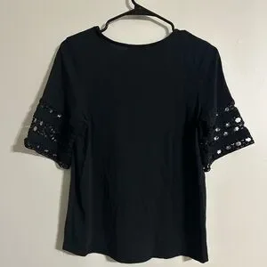 Elegant black top. Features lace detailing on sleeves. Perfect for any occasion.