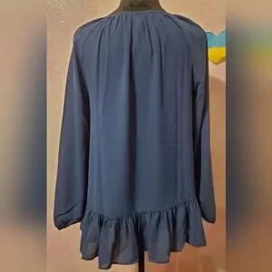 Chic navy blue blouse with elegant ruffle hem. Features a gathered neckline with bead accents. Perfect for versatile styling.