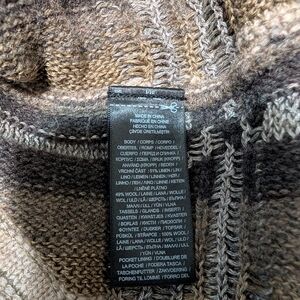 Stylish plaid poncho with fringe trim. Features a drawstring collar and front pocket. Ideal for layering.