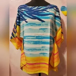Bright and colorful kaftan top with abstract patterns. Features shades of blue, yellow, and orange.