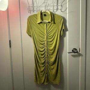 Stylish green button-up bodycon dress with ruched detailing. Short sleeves and collared neckline.