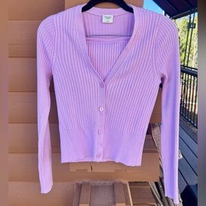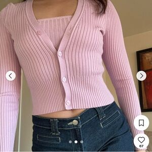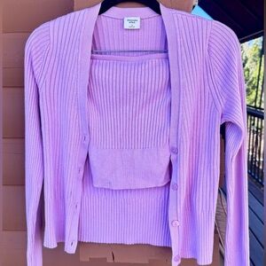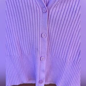 Stylish purplish pink ribbed knit cardigan set. Includes button up cardigan and tube top. Adorable, always received compliments when I wore this! Can wear the pieces separately and dress up or down.
