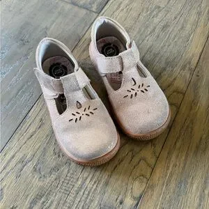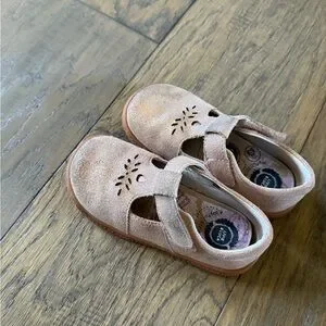 Charming blush suede Mary Jane shoes with floral cutouts.
