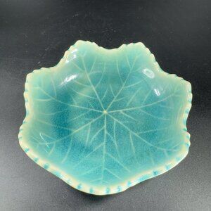 Vintage Japanese Ceramic Leaf Dish Plate Turquoise Crackle Glaze Spoon Rest VTG
