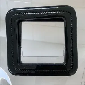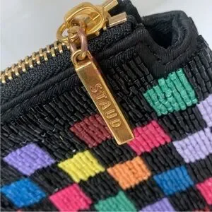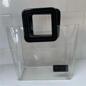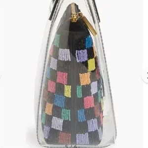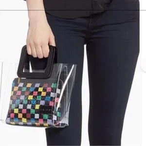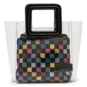 Transparent Staud multicolored beaded pouch Mini Shirley clear PVC bag handbag - NWOT - clear PVC mini tote w/black patent leather square double handles - open top - multicolor beaded checkerboard zipper pouch insert - new & never used w/out tags - dust bag included - measures approximately 7 5/8" wide measured side to side across front at bottom - 3 5/8: width measured at bottom side - 7 7/8" height measured to top of PVC tote - 10" high measured to top of handles