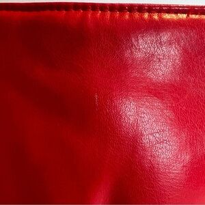 - Red crossbody and that can double as a clutch. Made of faux leather. It has a top zip closure with a ruching detail at the front. Has minor blemishes on the back that do not effect the use. In overall good condition.