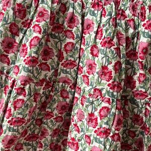 Puff sleeve ruched waist ruffle hem cotton dress with a round scoop neck in a size small. The floral print pattern is red, pink, ivory, and green.