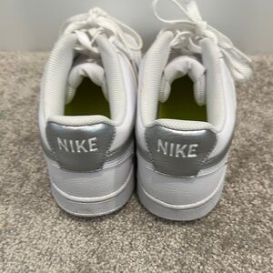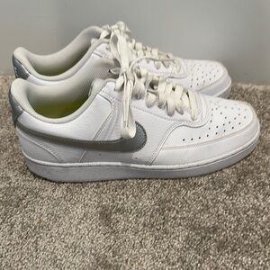 Step up your sneaker game with these stylish Nike Court Vision sneakers featuring a sleek silver swoosh. Inspired by classic court styles, these shoes blend retro vibes with modern comfort. The low-top design makes them easy to pair with just about anything, from jeans to joggers. Lightly worn and in excellent condition, they're perfect for everyday wear or elevating your athleisure look. Available in a size 9.5. Smoke free, kitty friendly home. Don’t miss your chance to snag these versatile kicks before they're gone!