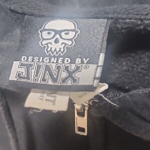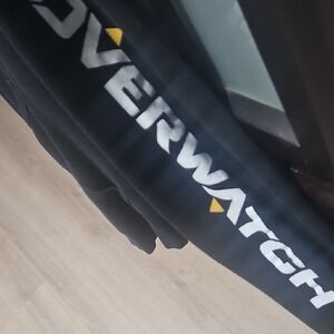Black zip-up hoodie featuring a Overwatch logo on the chest. Comfortable and stylish for casual wear.