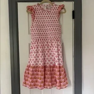 Stylish sleeveless dress with vibrant patterns. Features a tiered skirt and delicate ruffles.