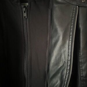 Guess Men’s Faux Leather with detachble Hooded Biker Jacket. Size M. Made of high quality faux leather. zipper front closure. Several zip pockets. The sweatshirt feel hood can be zipper all way up for warmth or unzipped and removed.quilted lining. Banded waist. Snap collar. Length 27”. Pit to,pit approx. 22” flat lay. Sleeve length 26”. Great condition.