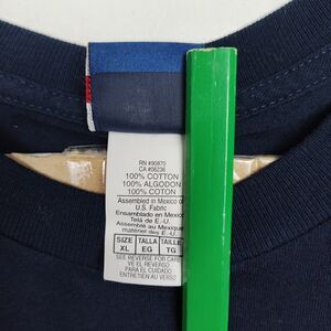 The product is a men's XL navy blue T-shirt featuring a Hawaii theme with a graphic print of palm trees and the words Waikiki Beach Hawaii. Made of cotton jersey fabric, this regular fit shirt has short sleeves, a crew neck, and is machine washable. The Champs Sports brand adds to the appeal of this stylish and comfortable piece of clothing, perfect for casual wear or lounging by the beach.