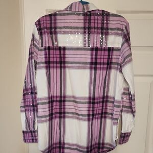 Stylish plaid blouse. Features pink and white colors. Sequined accents on pockets. Button-up front. Long sleeves.