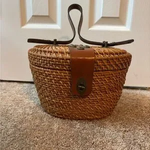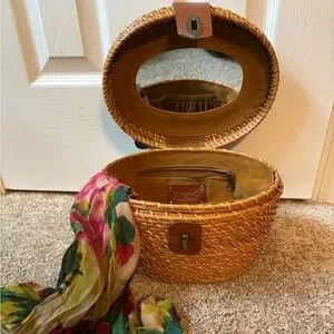 Chic and stylish brown woven basket bag perfect for any occasion. Features a secure clasp and a comfortable handle for easy carrying. Roomy inside with several pockets and a mirror on the lid. Comes with matching Patricia Nash scarf.