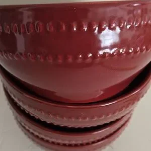 * Set of four cranberry red textured bowls.