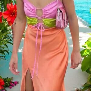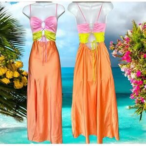 Show Me Your Mumu Calloway Cut Out Dress Cantaloupe SMALL Satin Slit $198 NEW