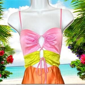 SMALL Satin Slit $198 NEW Crafted of lustrous satin, this slip dress, spaghetti straps, cut out waist strappy back. beach vibes from this gorgeous cocktail dress. Perfect for special occasions, special events, brunch, wine tasting, dinner date, vacation, wedding guest, cocktail, date night 100% polyester Made in USA Hand wash Partially lined Lace-up back with tie closure Adjustable shoulder straps Drawstring bust with cutout detail Satin fabric Revolve Style No. SHOW-WD569