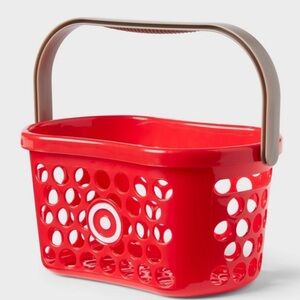 Bright red basket featuring a robust tan handle. Ideal for organizing party supplies or providing a delightful playtime experience for little ones. This charming target basket is absolutely adorable!
