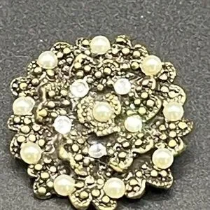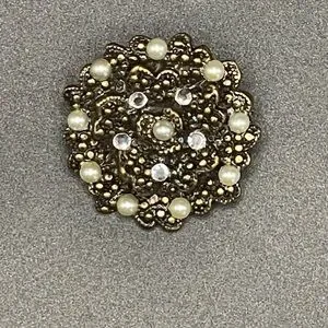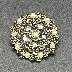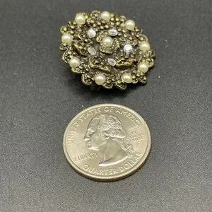 Step back in time with this exquisite vintage “Hidden Heart” brooch, a captivating gem from the glamorous era of American costume jewelry (1950s-1970s). This stunning piece features a beautifully intricate gold-tone filigree design that is sure to make a statement! 🌹✨ Adorned with luminous faux pearls and shimmering clear rhinestones, it radiates vintage charm and sophistication. 💖💎