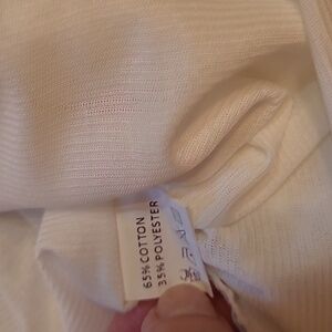 Elegant ivory tunic with intricate crochet design. Features a stylish draped neckline. Ideal for layering or wearing alone. Lots of detail.