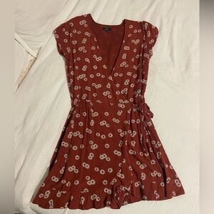 Stylish red wrap dress with white floral pattern. Perfect for any occasion.