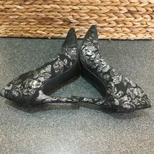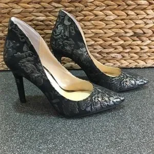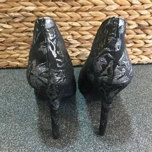 Elegant black lace heels. Pointed toe design. Perfect for formal occasions.