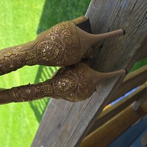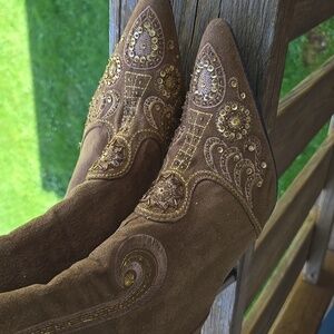 Step out in style with these elegant embroidered brown boots. Perfect for any occasion, these boots offer both comfort and fashion.Beautiful SOFT SUEDE LIKE FEEL MATERIAL These boots are in VERY GOOD Condition!! FAST SHIP!!