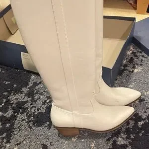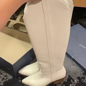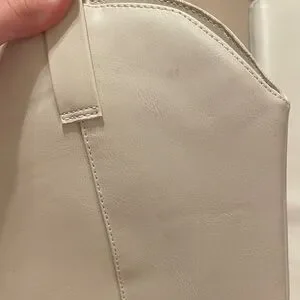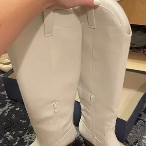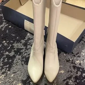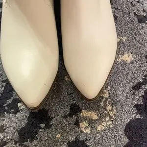 Chic white boots with a sleek design. Perfect for versatile styling. Comfortable heel for all-day wear.