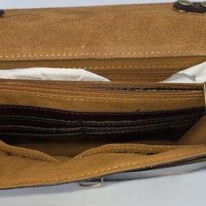 Interior: 1 rear zip pocket, 1 zip compartment and 2 slip pockets. Front compartment includes 6 credit card slots, front slip pocket under flap. Faux suede lining, 100% polyester