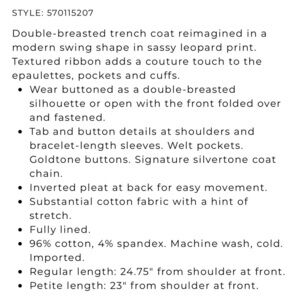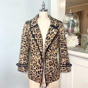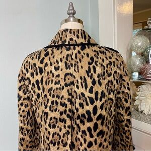 White House Black Market Leopard Print Swing Jacket. Double breasted trench coat reimagined in a modern swing shape in a sassy leopard print. Textured ribbon adds an extra touch to the epaulettes, pockets and cuffs. Wear buttoned or open in two styles. Two pockets in front with goldtone buttons. Fully lined. Inverted pleat in back for easy movement. 3/4 length sleeves. Like new, only worn once. Size 4.