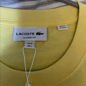 Vibrant lemon tee featuring Lacoste logo. Casual and trendy.