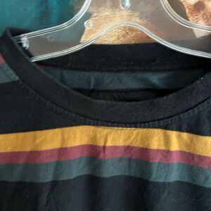 Add a vibrant touch to your wardrobe with the Black Multicolor Striped Tee. This short sleeve shirt features bold stripes in black, red, and yellow, perfect for casual outings. See measurements before purchase.