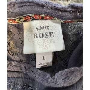 The Knox Rose Crochet Blue Boho embroidered Flowy long sleeve Top in size Large is a stylish and versatile addition to any woman's wardrobe. Made from rayon fabric with a crochet accent, this top features a solid gray color and intricate embroidered details. The round neckline, button closure, and regular fit make it perfect for casual occasions in the winter, fall, or spring seasons. The boho style and embroidered details add a touch of femininity to this trendy T-shirt from the brand Knox Rose.