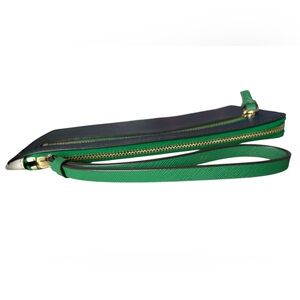 Kate Spade Saffiano leather medium wristlet with L-zip in blue, white, and Verona green. Gold tone hardware. Navy blue lining. 4 credit card slots. Measures 8x5. No flaws.