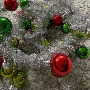 Crate & Barrel Christmas Garland – 9 Ft Silver Tinsel with Red & Green Ornaments