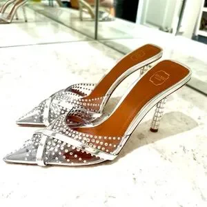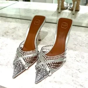 Stunning and sophisticated Malone Souliers heels featuring clear with sparkling crystal embellishments and silver metallic trim. Signature pointed toe and sleek stiletto heel design. Elegant, modern, and perfect for any special occasion or night out. These heels catch the light beautifully — a true statement pair that elevates any outfit! Great for engagement, wedding, new years, or any place to make a statement.