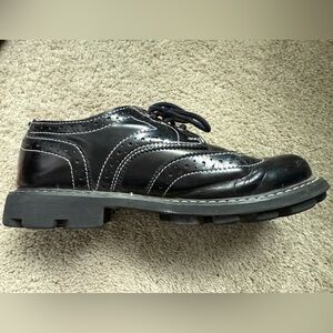 John Fluevog Black Leather Brogue Saddle Stitch Oxford Lace Up Shoes