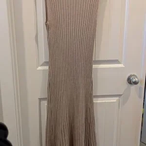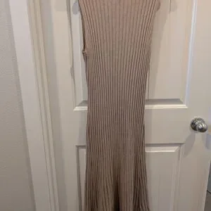 Elevate your style with this elegant sleeveless ribbed knit dress. Perfect for any occasion, this taupe dress offers a flattering fit and timeless appeal.