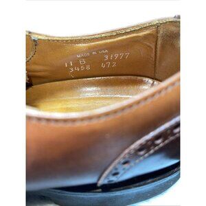 This is a pair of Allen Edmonds men's cap toe loafers in size 11. The shoes are brown oxford style dress shoes made of leather with a B width.