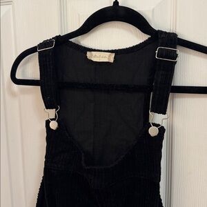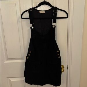 Stylish black corduroy dress. Features adjustable straps and front pockets. Perfect for casual outings.