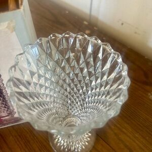 Beautiful vintage Indiana Glass “Diamond Point” vase in clear pressed crystal glass. Features the classic diamond-cut texture that sparkles in the light, with a flared top and pedestal base.