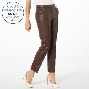 These are a like new pair of Jaclyn Smith faux leather brown seamed slim fit pants. They have button and double clasp/zip closure with front hand pockets. The last photo is a stock photo of a model wearing the same exact pants so you can see how they fit. They are size small, which is specked to fit a size 4/6..waist measures 14 1/2" flat. Excellent condition. #fauxleatherpants #jacklynsmithpants #brownleatherpants