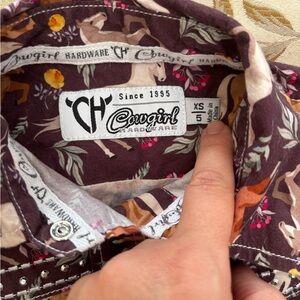 Stylish western shirt with a horse print design. Features a mix of brown, orange, and white colors.
