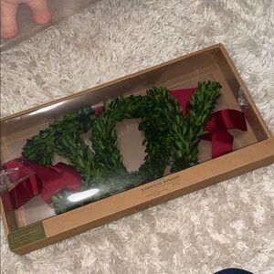 Celebrate the season with this elegant 'JOY' garland. Featuring lush green foliage (preserved Boxwood Leaves) and a vibrant red ribbon, it's perfect for adding a festive touch to your home decor. Ribbon measures 6 feet wide - has loops on each end for hanging purposes. Used once for a company holiday party - safety pins helped it hang better and are still in ribbon- see pictures. Very natural looking and can be used year after year.